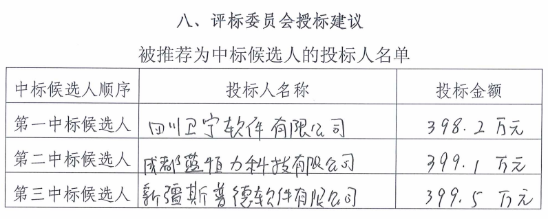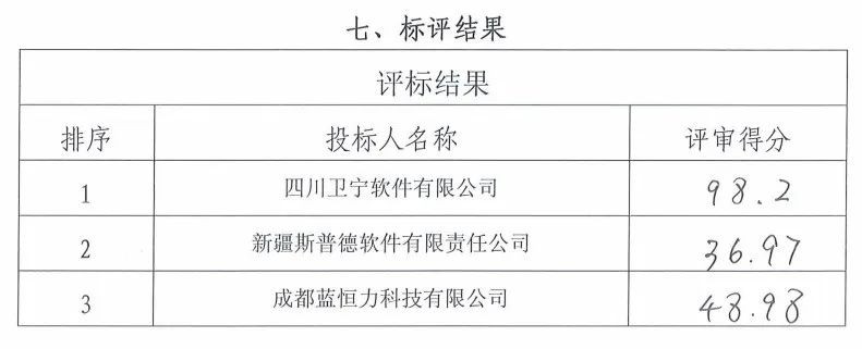 根据评标文件,当时参与投标的有四川卫宁软件有限公司、新疆斯普德软件有限责任公司、成都蓝恒力科技有限公司。评标结果显示,四川卫宁软件有限公司得分98.2,新疆斯普德软件和成都蓝恒力科技分别得分36.97、48.98。最终四川卫宁软件有限公司以398.2万元的金额中标。