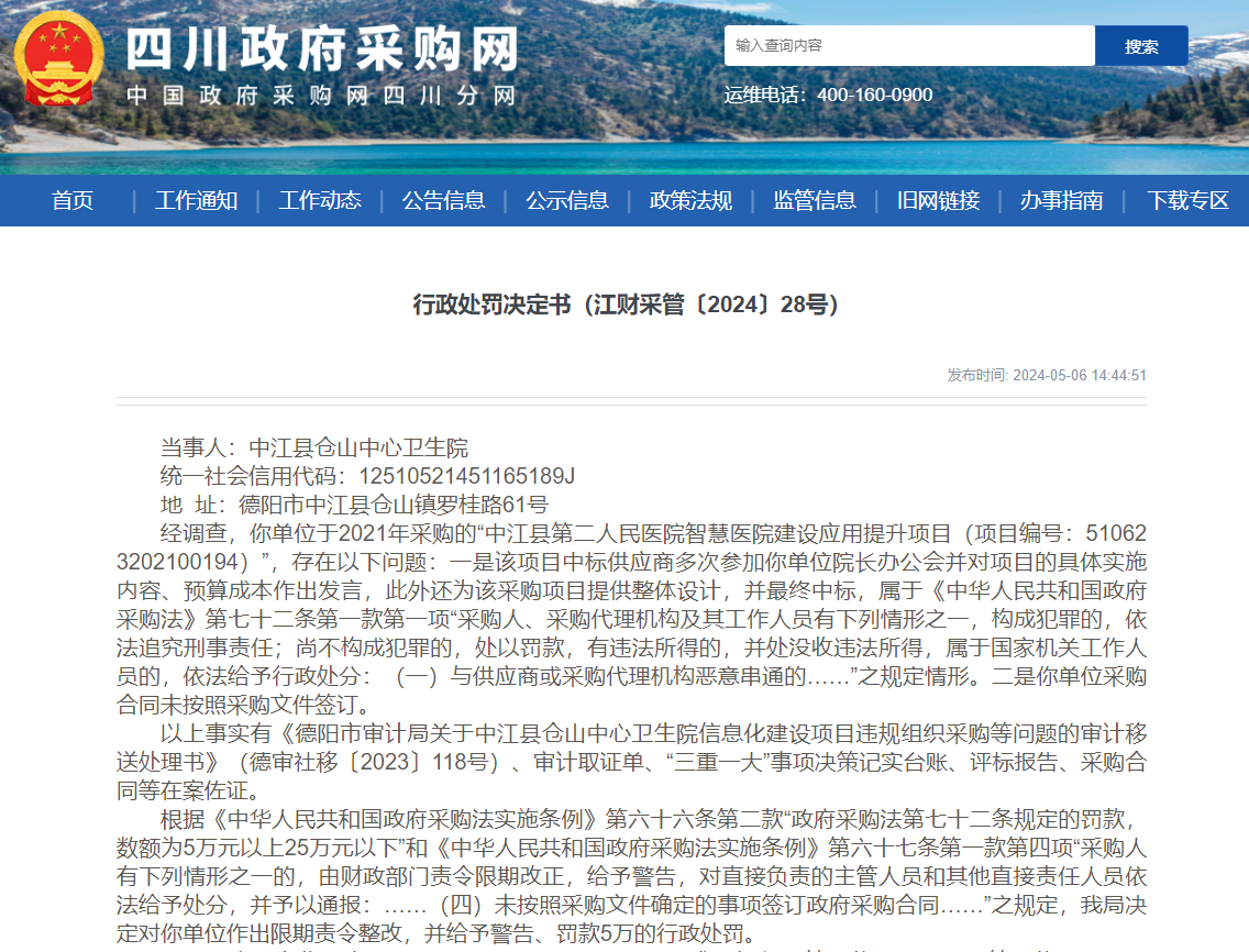 处罚决定书显示,中江县仓山中心卫生院于2021年采购的“中江县第二人民医院智慧医院建设应用提升项目(项目编号:510623202100194)”存在两方面问题: