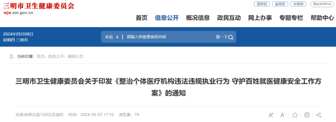 5月7日,“医改先锋”福建三明市的卫生健康委员会公开了一则新的工作方案——《整治个体医疗机构违法违规执业行为守护百姓就医健康安全工作方案》。
