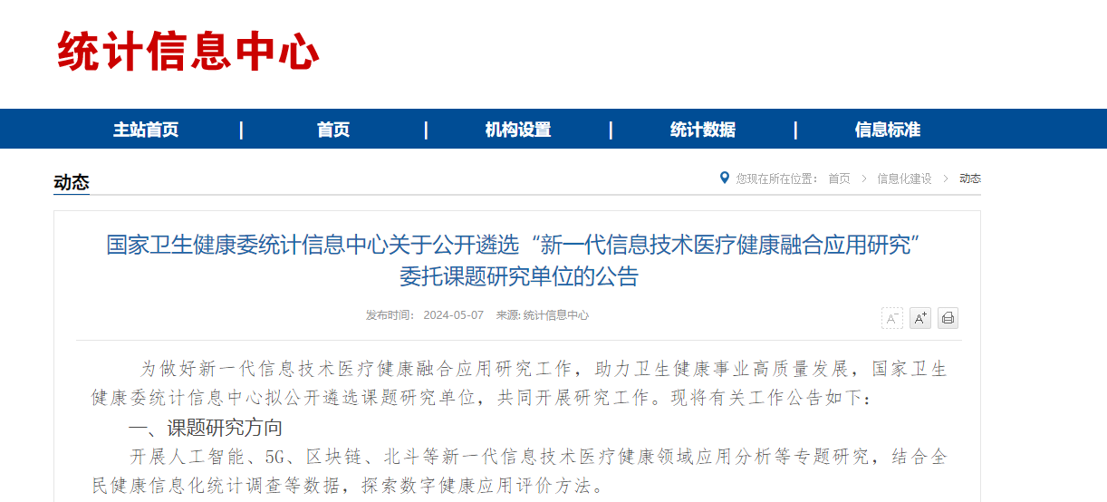 为做好新一代信息技术医疗健康融合应用研究工作,助力卫生健康事业高质量发展,国家卫生健康委统计信息中心拟公开遴选课题研究单位,共同开展研究工作。现将有关工作公告如下: