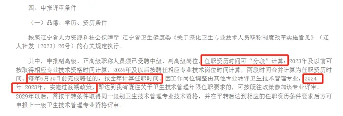 其中,申报副高级、正高级职称人员须已受聘中级、副高级岗位,任职资历时间可“分段”计算:2023年及以前可按取得相应专业技术资格时间计算,2024年及以后按聘任相应专业技术岗位时间计算,两段时间合并计算为任职资历时间。每年6月30日前完成聘任的,按全年计算任职时间。因工作岗位调整由其他专业转评卫生技术管理专业,2024年-2028年,实施过渡期政策,即达到我省既往关于卫生技术管理年限任职要求的,可按既往政策参加该专业评审。2029年以后,需按平转条件取得同一级别卫生技术管理专业技术资格,并在平转后达到相应的任职资历条件要求后方可申报上一级卫生技术管理专业资格评审。