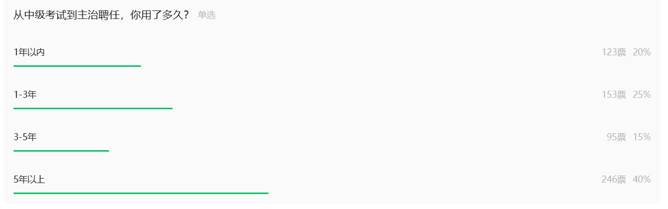 华医网曾在文章:《中级过了5年才聘主治,心塞!你们从考完到聘用要多久?》中发起投票:《从中级考试到主治聘任,你用了多久?》,目前,共有617人参与投票,根据投票结果显示:40%的网友表示需要五年以上才被聘任。