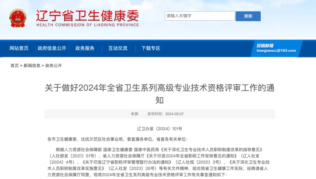 近日,辽宁省卫生健康委员会发布《关于做好2024年全省卫生系列高级专业技术资格评审工作的通知》(以下简称《通知》),对医疗卫生系统高级职称的评审给出了新的要求。