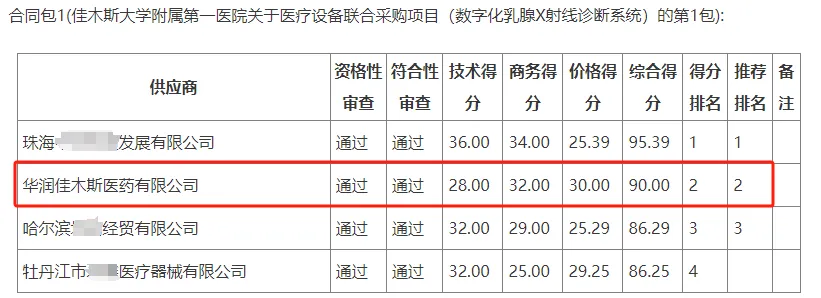 此次投诉便是发生在这家大三甲医用设备采购过程中。去年9月,佳木斯大学附属第一医院发布招标公告,预算2670万元采购1台数字化乳腺X射线诊断系统。11月项目开标,由珠海****发展有限公司中标,成交金额2650万元,华润佳木斯医药有限公司以仅仅五分之差排在第二名。