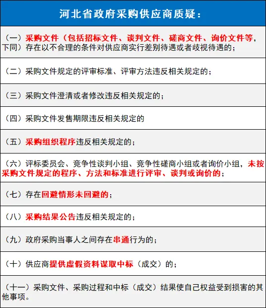 以河北省为例,其新规清楚列举出【供应商质疑】的十一大类情况,所涉条款覆盖采购活动全过程,更充分考虑了采购程序及中标的合规性、评审方法/标准合理性等问题。