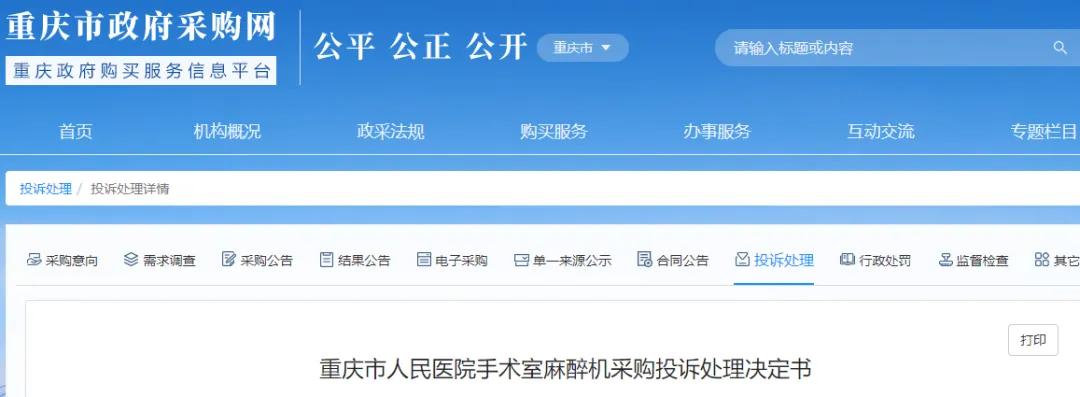 如去年12月,重庆市人民医院手术室麻醉机采购项目被投诉。
