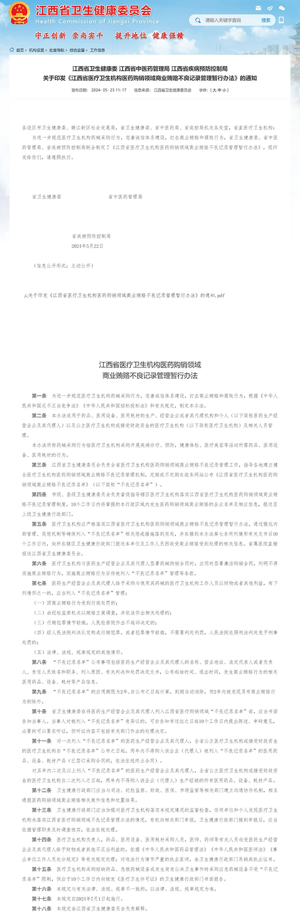 近日,江西卫健委官网发布《江西省医疗卫生机构医药购销领域商业贿赂不良记录管理暂行办法》(完整附文末),将于2024年7月1日起施行。