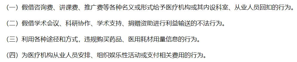 3月,河南省市场监督管理局发布《医药生产经营企业防范商业贿赂行政指引》,公布了医药生产及经营企业对于医疗机构的贿赂行为方式,具体如下: