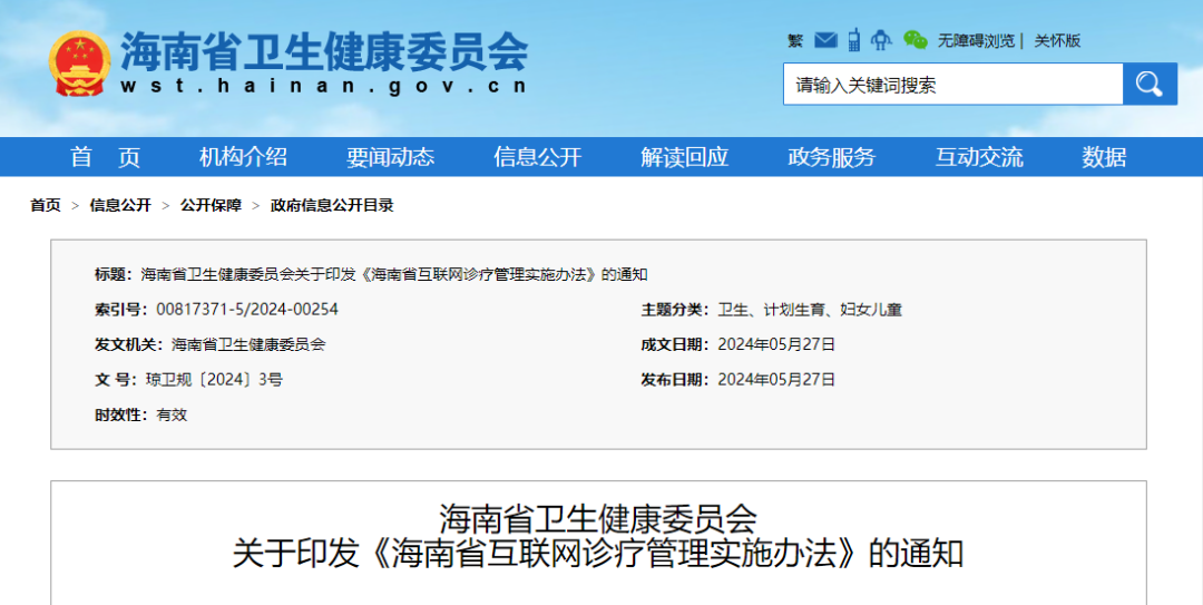 同时,海南省卫生健康委员会还配套发布了《互联网医院基本标准(试行)》,详细规定了互联网医院建设的人员、设施设备、规章制度等要求。