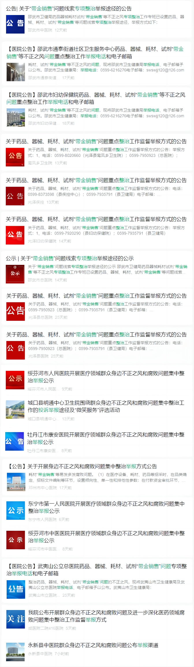 还有5月10日,福建南平市卫健委启动药品、器械、耗材、试剂“带金销售”问题重点整治工作,面向社会公布举报方式,同时强调鼓励实名举报。