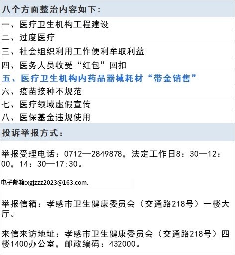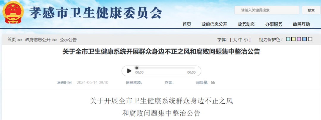 6月14日,孝感市卫健委官网发布公告,指出市卫健委、市医保局、市市场监管局三部门决定从即日起至10月31日,在全市卫生健康系统内开展群众身边不正之风和腐败问题集中整治工作。