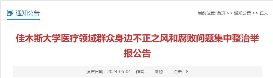 据佳木斯大学医药反腐办公室6月4日消息,佳木斯大学附属第一医院、附属第二医院(口腔医院)、附属第三医院、校医院,启动了医疗领域群众身边不正之风和腐败问题集中整治工作,并对外公开举报热线。