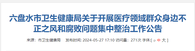 贵州六盘水卫健委5月27日发文,明确重点整治医务人员在设备、药品采购使用等方面吃回扣、收好处,医药“带金销售”,整治时间为2024年5月起至2024年10月。