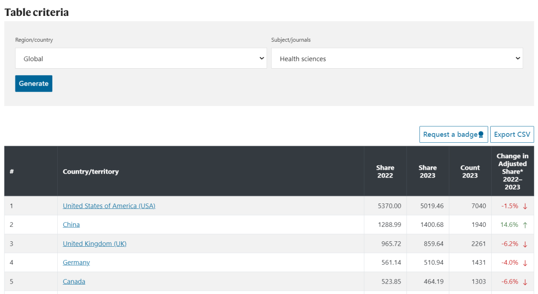 值得一提的是,在健康科学领域全球前五名国家中,中国是唯一保持正增长的,与2022年相比,中国的调整后份额增长了14.6%,遥遥领先于其他四国。