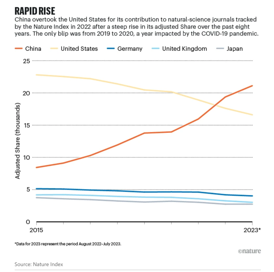 近年来,中国科研论文的产出一直保持着10%以上的增长速度。早在2018年,美国国家科学基金会的数据就显示,中国发表的论文数量最多。从2015年至2023年的「自然指数」来看,中国在高质量研究成果方面一直在迅速缩小与美国的差距。