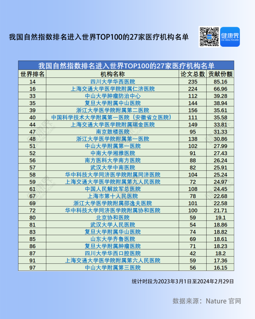 健康界查阅榜单发现,全球医疗机构自然指数排名百强中共有42家来自美国,27家来自中国。其中排名最为靠前的五家中国医院分别是: