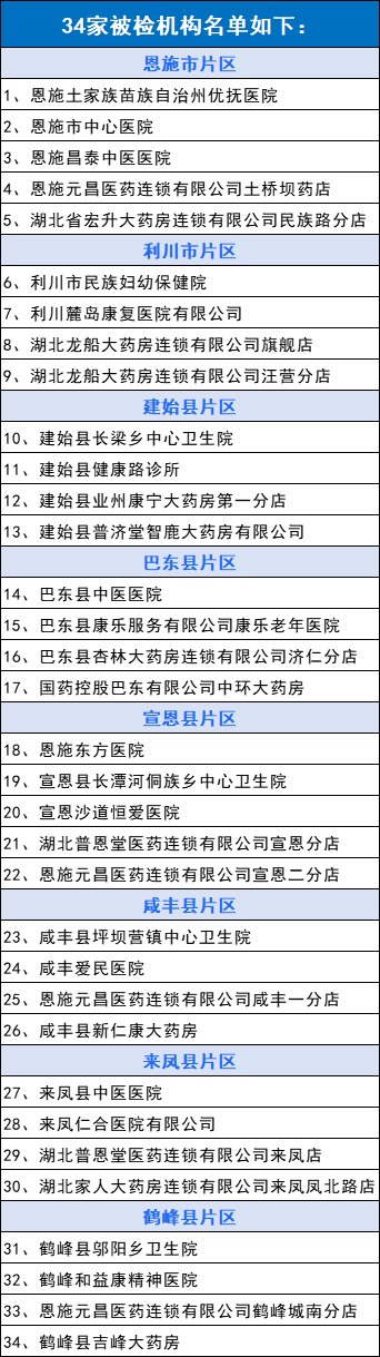 6月18日,湖北恩施州医保基金使用和运行情况飞行检查工作正式启动,全州34家定点医药机构被随机抽取为飞行检查对象(下附名单)。