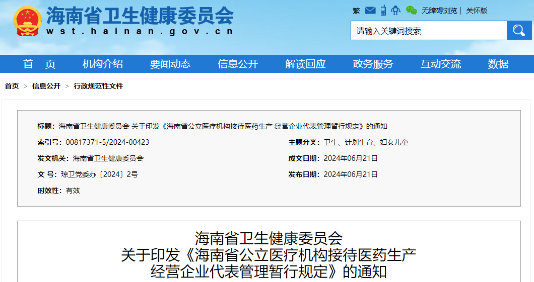 近日,海南省卫健委官网印发了《海南省公立医疗机构接待医药生产经营企业代表管理暂行规定》(以下简称《暂行规定》)。