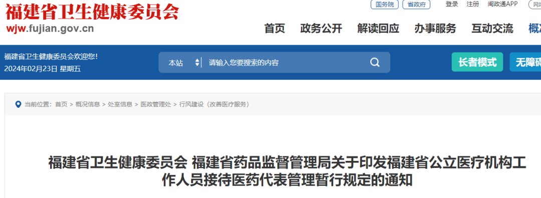 今年2月,福建省率先发布《福建省公立医疗机构工作人员接待医药代表管理暂行规定》,并于2024年3月1日起执行,有效期2年。