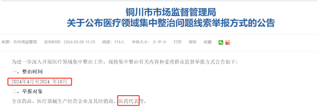 如5月6日,铜川市市监局公布医疗领域集中整治举报热线,整治期从2024年4月一直持续到10月底,举报对象为全市药品、医疗器械生产经营企业及其经销商、医药代表等。