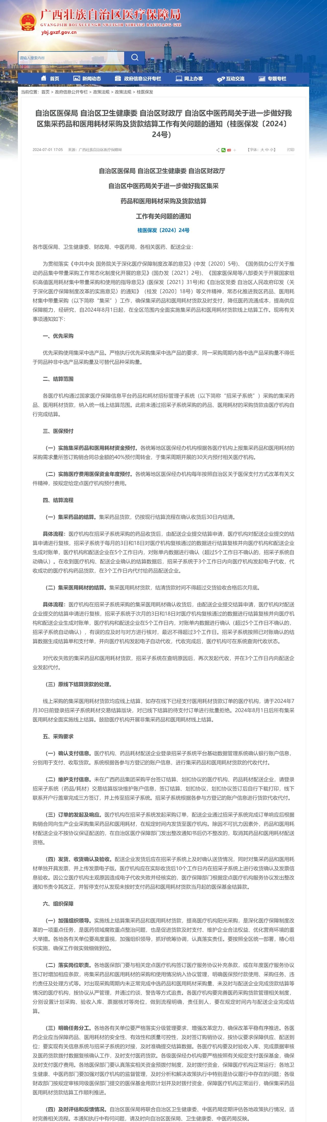 根据《通知》,广西自2024年8月1日起,将在全区范围内全面实施集采药品和医用耗材货款线上结算工作。