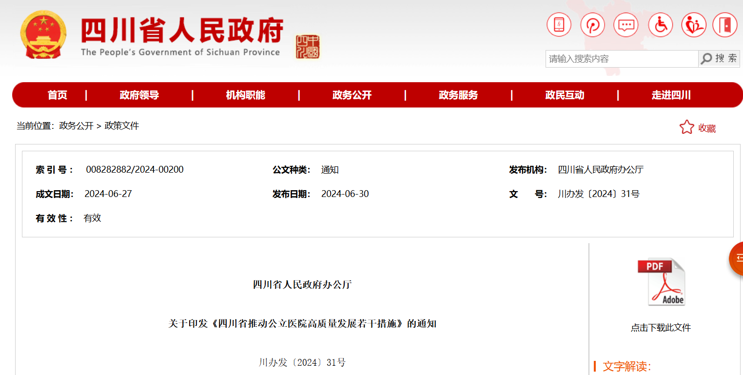 6月30日,四川省人民政府办公厅印发《四川省推动公立医院高质量发展若干措施》(简称《措施》),提出落实各级政府办医管医责任、完善医院内部管理体系和机制、加快推进医疗服务价格改革、深化人事和薪酬制度改革等10项措施。
