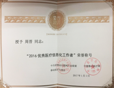 北京神黄科技股份有限公司的CEO周晋,始终本着工匠精神打造产品,塑造严谨、高效、积极地团队工作理念,具有敏锐的市场洞察力和果断的决策能力,同时在中国数字医疗网(HC3i)携手中关村移动互联网产业联盟移动医疗专委会(ZMH)举办的“2016优秀医疗信息化工作者评选”活动中,荣获“2016优秀医疗信息化工作者评选”荣誉称号。