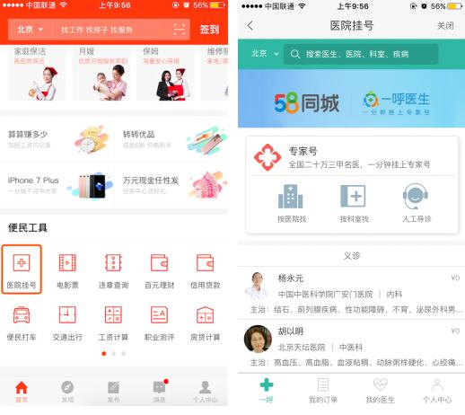随着双方合作的达成,用户打开58同城客户端首页界面,在“便民工具”板块中点击“医院挂号”按钮,就会显示一呼医生专家预约页面,在搜索框中填写医生、医院、科室、疾病等关键字,就会出现专家列表推荐,点击进入专家预约页面,输入患者信息,完成预约流程。其后用户则会收到一呼医生后台的就医提示短信及电话跟进,一直到医院就医陪诊结束。