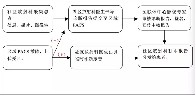 1.2 医联体区域PACS工作流程 如图2所示,病人信息经系统录入后可直接从PACS主数据库中被各方调用。患者完成影像检查后,社区放射科医师通过电脑快速调阅、浏览及处理影像资料。社区医生遵从医联体上级医院放射科的统一诊断模版,进行诊断报告规范化编辑,可减少输入工作量、缩短报告生成周期,提高工作效率。设置不同权限,社区放射科医生书写初诊报告,经上级医院放射科专家(副主任医师及以上医师)审核,系统对修改内容进行修改痕迹保留,审核完成的报告经医师签字确认后方可提交上传至主服务器存储备份,再由社区放射科打印发放。打印完成后的报告不能再进行修改,以只读方式调阅参考。