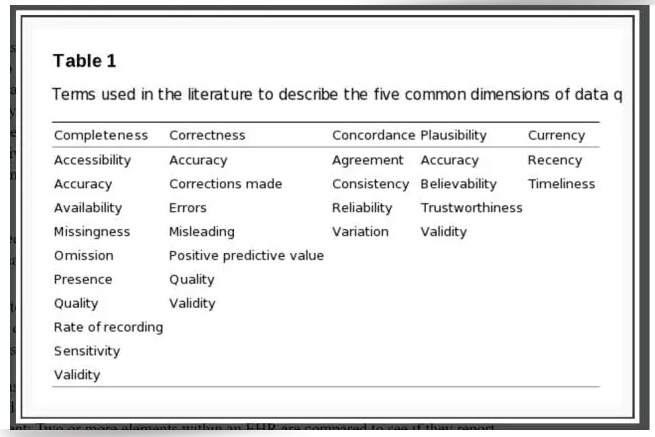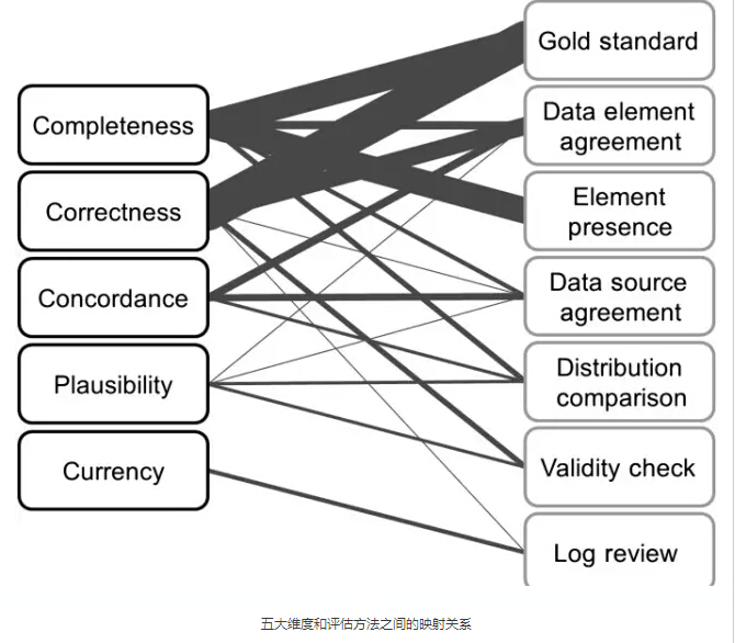 医疗数据质量首先要确定的是评估的维度。作者经过全面、系统性的综述总结出五个维度: