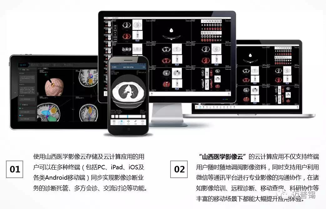 “山西医学影像云”的云计算应用不仅支持终端用户随时随地调阅影像资料,同时支持用户利用微信等通讯平台进行专业影像的沟通协作,在诸如影像培训、远程诊断、移动查房、科研协作等丰富的移动场景下都能大幅提升应用体验。目前,与中心已对接38家医院将整体加入山西医疗影像云的建设,同时大同市第三人民医院携其医联体接入27家医院、以晋中市第一人民医院牵头接入22家医院、以吕梁市卫计委牵头汾阳医院为试点,选其下属一个县医院及其下属所有乡镇卫生所接入系统。