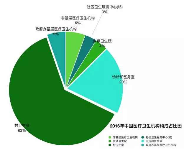 从医疗卫生机构总数来看,基层医疗机构数量大幅增长,2016年末,全国医疗卫生机构总数达983394个,其中基层医疗卫生机构926518个,同比增加5748个。基层医疗卫生机构中,社区卫生服务中心(站)34327个,乡镇卫生院36795个,诊所和医务室201408个,村卫生室638763个。政府办基层医疗卫生机构54379个。
