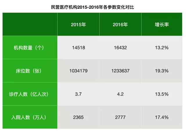 公报显示,从数量来看,截至2016年底,中国共有公立医院12708个,民营医院16432个。其中,公立医院床位占78.3%,民营医院床位占21.7%,且后者增速为19.3%,明显快于公立医院3.7%的床位增速。从诊疗人数来看,2016年公立医院诊疗人次28.5亿人次,占医院总数的87.2%;民营医院4.2亿人次,占医院总数的12.8%,同比增长13.5%。从入院人数来看,2016年,公立医院入院人数14750万人,占医院总数84.2%,民营医院2777万人,占医院总数15.8%,同比增长7.5%。