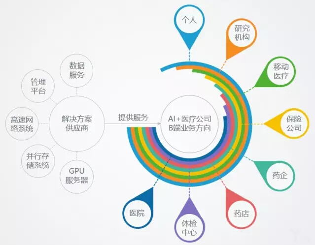 人工智能+医疗新领域的出现,创造了与医疗相关的产业链新模式,在逐步解决医疗产业各大痛点的同时,也创造着市场需求和相关企业新的增长突破点。医疗人工智能企业目前主要以B端业务为主,极少健康类产品面向C端市场。医疗人工智能公司因其刚性技术与服务需求,也为解决方案提供商带来了新的服务方案和商业机会。综合来看,医疗人工智能拥有广阔市场需求与多元业务方向,发展机会非常丰富。