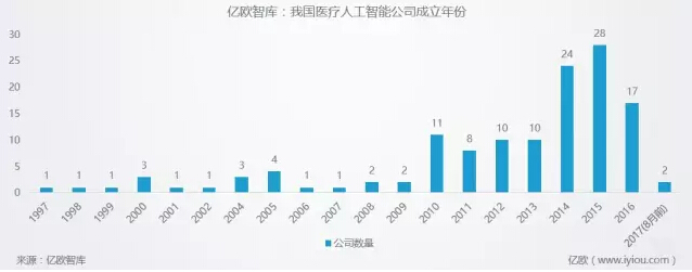 2010年是我国医疗人工智能领域创业分水岭,此前每年出现的新创公司数量极少,而2010年后我国迅速出现一大批医疗人工智能公司,并于2014和2015年出现创业高峰,两年内出现52家创业公司。