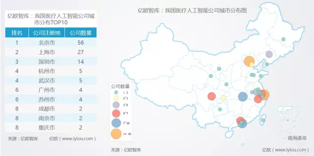 截止到2017年7月31日,我国医疗人工智能公司共有131家,集中分布于北京、上海、深圳、杭州、武汉等一、二线城市,其中北京、上海、深圳三城集中了97家公司,占全部公司的76%左右。