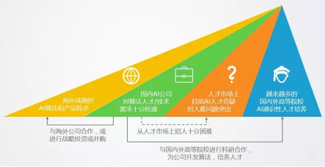 人工智能技术人才目前在市场上处于供不应求的状态。针对该问题,公司最佳策略之一,就是与进行人工智能相关研究的国内外高等院校进行科研合作,合作基于公司产品技术应用方向(如医学影像分析、语音电子病历文字转写等)进行算法模型的开发,该合作不仅推动了公司产品化进程,而且也潜移默化地为公司培养未来的算法人才。相比国内,海外成熟的算法模型较多,产品化和产品落地速度普遍领先于国内。国内人工智能公司有机会与海外公司进行战略合作,共同进行基于中国市场环境的模型训练和产品研发;资金雄厚的公司则可以通过战略投资、并购等方式,直接获得整个技术与产品研发部门。