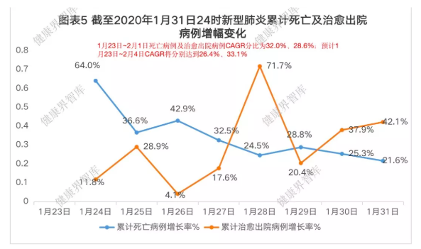 累计死亡病例增幅持续下滑,治愈出院病例增幅波动式上升。截至2020年2月1日24时,治愈出院病例由1月24日的11.8%上升到2月1日的35.0%,1月23日-2月1日治愈出院病例复合增长率CAGR28.6%,治愈率明显提高。死亡病例增幅持续下降,由1月24日的64.0%下降到2月1日的17.4%,1月23日-2月1日死亡病例复合增长率CAGR32.0%,死亡病例增幅逐渐下降。综合分析治愈出院病例和死亡病例增幅情况,抗击新冠肺炎的战役仍面临重大压力和挑战。