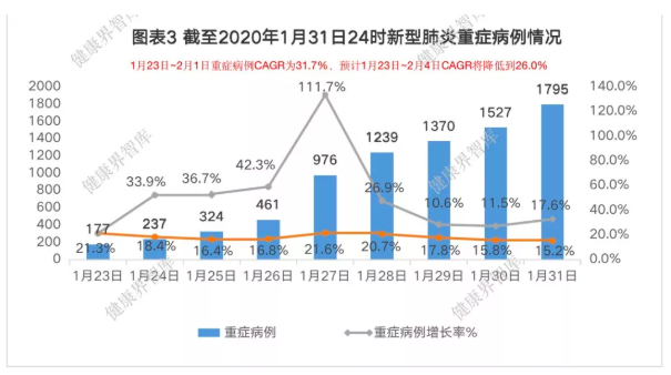 重症病例占比逐渐降低。截至2020年2月1日24时,在确诊病例中,重症病例占比也由最高时的21.6%下降到当前的13.2%,重症病例占比逐渐降低。从增幅来看,1月23日-2月1日,9天重症病例复合增长率CAGR31.7%,日均增幅也由1月27日前的日均增幅超过30%逐渐下降到2月1日的17.5%。根据重症病例近9天的复合增长率变化趋势,我们预测:1月23日-2月4日12天重症病例复合增长率将下降为CAGR26.0%,2月4日重症病例将达到2847例,占比下降为13.2%。