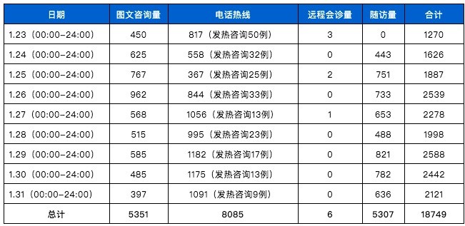 1. 互联网医院增设发热咨询门诊和新型冠状病毒问诊专区,联合多学科协同,开展免费义诊。互联网医院目前可以视频、图文、对话(文字)的方式,由医生向患者提供1对1服务。截至1月31日晚上九点,服务5227人次,每天700人左右。所有就诊人员中以发热就诊为主,其中1/3的咨询者有焦虑甚至是恐慌的情绪。自开诊以来,从互联网医院筛查发现并确诊了1例新型冠状病毒的肺炎患者,起到了初步筛查作用。