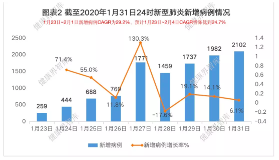 新增确认病例数增幅明显放缓。截至2020年2月1日24时,纵观全国新增确诊病例发展情况来看,新增确认病例数增幅放缓,呈波动中逐渐减少态势。1月23日-2月1日,9天新增确诊病例人数复合增长率CAGR29.2%。疫情在全国人民万众一心、全力以赴的努力下,新增病例增幅明显放缓。根据新增病例近9天的复合增长率变化趋势,我们预测:1月23日-2月4日,12天新增确诊病例复合增长率将下降为CAGR24.7%,2月4日新增病例达到3679例。