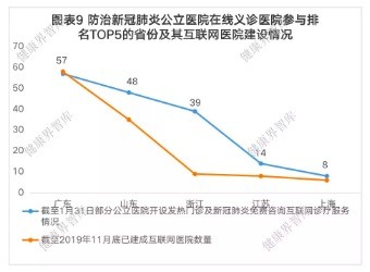 截至2020年1月31日,我们收集统计了开设发热门诊及新冠肺炎咨询互联网诊疗服务的公立医院排名TOP5的省份,对比截至2019年11月底该省份已建成互联网医院数量,我们发现,在这次防治新冠肺炎的过程中,开设发热门诊及新冠肺炎咨询互联网诊疗服务的公立医院已超过当地已建成互联网医院数量。
