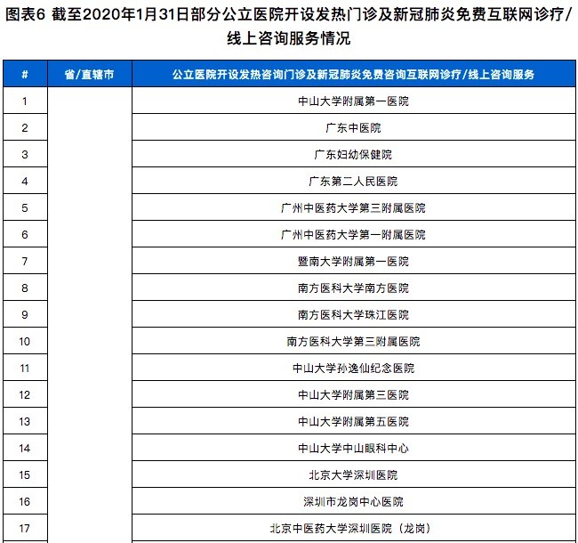图表6 截至2020年1月31日部分公立医院开设发热门诊及新冠肺炎免费互联网诊疗/线上咨询服务情况