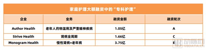 在上半年的7笔融资中,我们注意到Author Health、Monogram Health、Strive Health3个聚焦于家庭护理中某类慢病管理的项目,实际上是基于国情,在“互联网+护理”赛道中的“专科护理”领域里的探索。