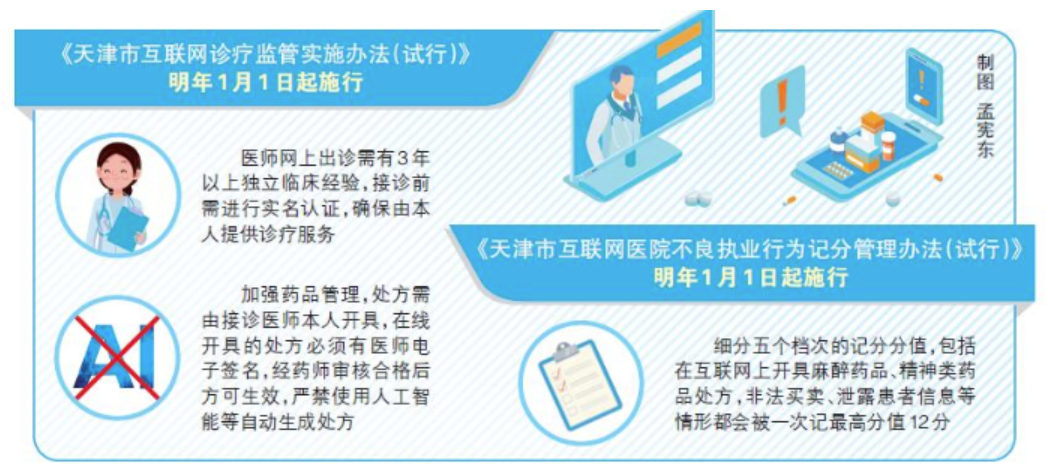 据了解,《天津市互联网诊疗监管实施办法(试行)》将于明年1月1日起施行。根据该办法,医师开展互联网诊疗活动应当依法取得相应执业资质,在互联网医院依托的实体医疗机构或其他医疗机构注册,具有3年以上独立临床工作经验;接诊前需进行实名认证,确保由本人提供诊疗服务。