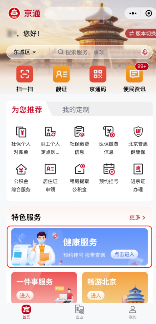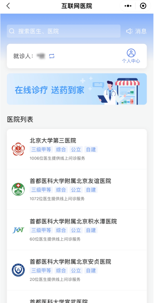 为方便患者线上就诊,我们新增了互联网医院功能,目前已接入北医三院、友谊医院、积水潭医院、安贞医院、宣武医院、北京儿童医院、北京中医医院、首都儿科研究所、妇产医院、回龙观医院、首钢医院、北京大学国际医院等12家互联网医院,患者通过微信中的“京通”小程序“健康服务”统一入口,即可进入各家互联网医院,享受线上问诊、在线开处方、药品配送到家等服务,实现“多医院、一入口”就诊。