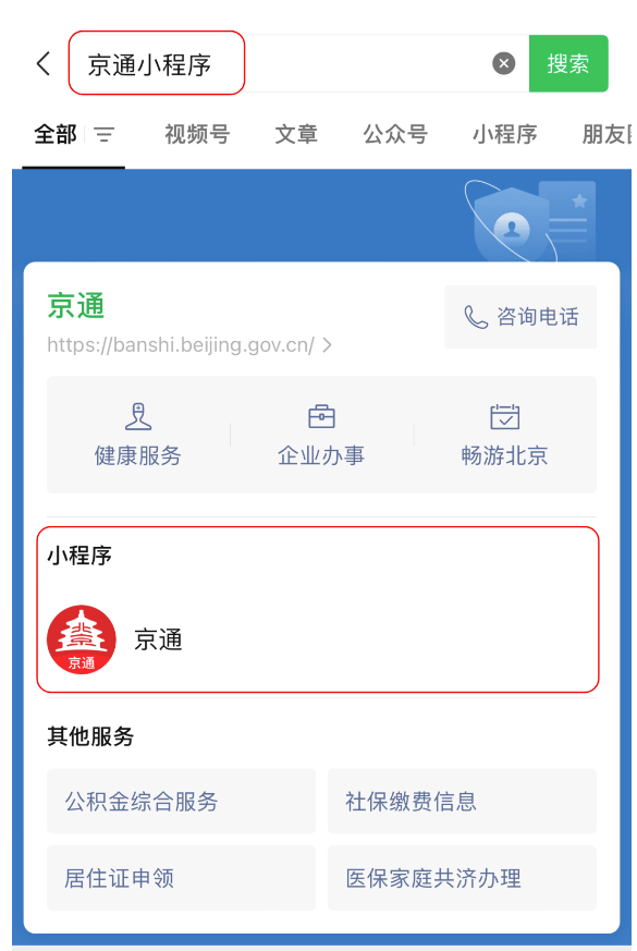 1、微信APP搜索“京通”小程序