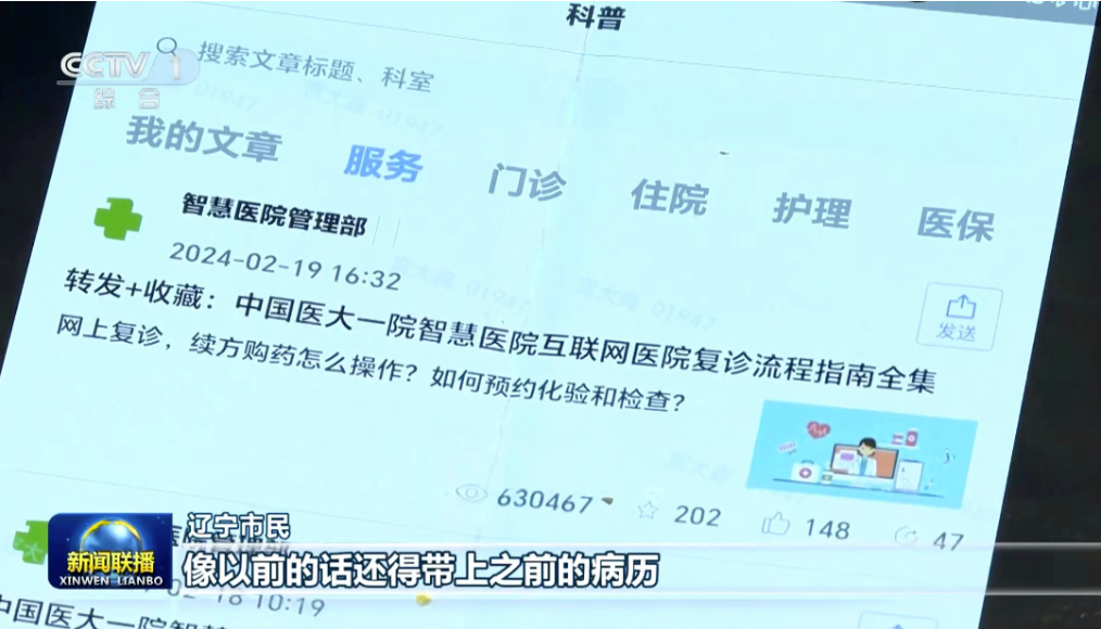 2月29日,中央广播电视总台《新闻联播》栏目“奋进中国式现代化,加快数字中国建设,为中国式现代化注入强大动力”报道中,播放了中国医科大学附属第一医院智慧医疗的服务场景。