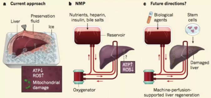 将器官浸润在保存液中置于冰上,这样可以有效地降低代谢,但随之也会出现很多不良的问题。比如肝脏可能随着ATP的减少而损害,同时有害的活性氧开始积累、线粒体损伤等,当移植完成后血液再次流过器官,很可能会引起炎症反应,同时由于器官细胞的代谢减慢,无法通过转氨酶等生化指标评估器官质量。