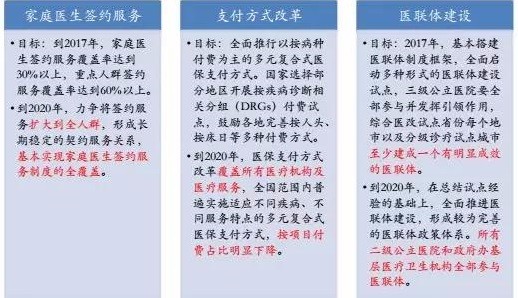 从上图,我们可以清晰地看到,到2020年,家庭医生签约要全覆盖,医保支付方式改革全覆盖,医联体建设也要覆盖到所有公立医院。